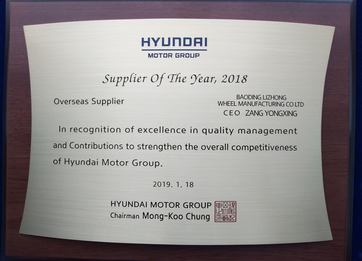 2019年1月,現代起亞汽車集團授予保定市立中車輪制造有限公司“優秀供應商”獎項并頒發證書。集團總裁張建良先生作為集團代表出席了大會并接受頒獎。 此獎項是現代起亞汽車集團對供應商開發能力、交付能力及品質保證的全面認可,意義非凡。